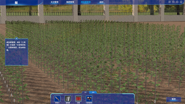 本项目通过虚拟仿真的模拟操作,让学生在接触实际果蔬栽培操作前,能够对整个栽培过程施工有深入的了解,同时通过大量的虚拟仿真模拟训练,从而减少现场操作的失误,缩短实际现场操作时间。软件内含六种果蔬栽培养护管理流程的真实仿真操作,分别为:草莓、葡萄、苹果、梨树、桃树、西瓜。